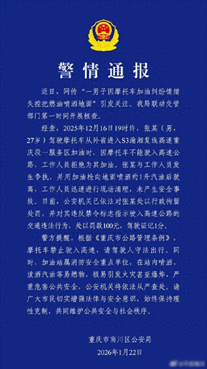 那天晚上七點多,在重慶南川的一個高速服務區里,有個27歲的小伙子騎摩托車想加油,工作人員告訴他摩托車不能上高速,所以不給加油,小伙子沒多說什么,直接拿起加油槍往地上噴了大約一升汽油,然后騎車離開,現場沒有人受傷,也沒有起火,工作人員趕緊把地面清理干凈,警察第二天就找到了他,對他處以拘留和100元罰款,還扣了1分。